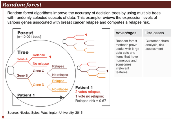 What’s the right algorithm for the task? This visual primer shows the most common ones in use and the business problems they can solve (also check out two related infographics on an overview of machine learning, as well as its evolution) e.g. random forest algorithms